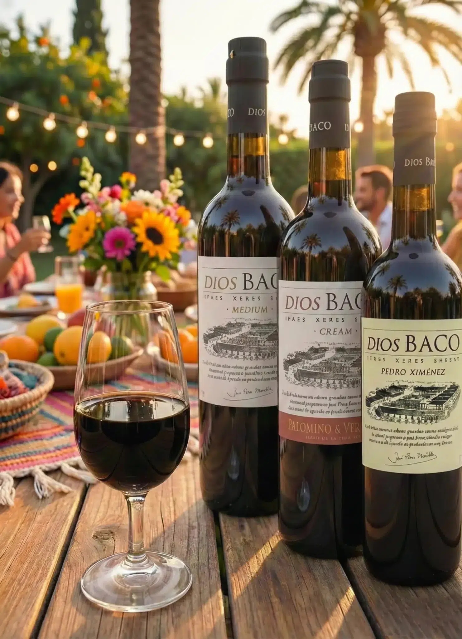 - Dios Baco Cream: La armonía líquida. Un vino generoso de licor obtenido mediante la mezcla de Oloroso y Pedro Ximénez. Es aterciopelado, con recuerdos a nueces y pasas. Perfecto para disfrutar con hielo y una rodaja de naranja o acompañando frutas ácidas.